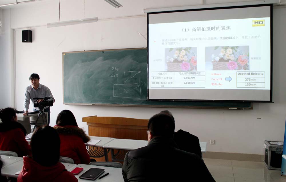 12月25日下午,索尼(中国)专业系统集团技术人员孙念慈应邀在365英国上市公司1-601教室作了一场题为《索尼专业摄像机使用技术交流》的学术报告。公司2013、2014级员工及部分老师共60余人聆听了报告。