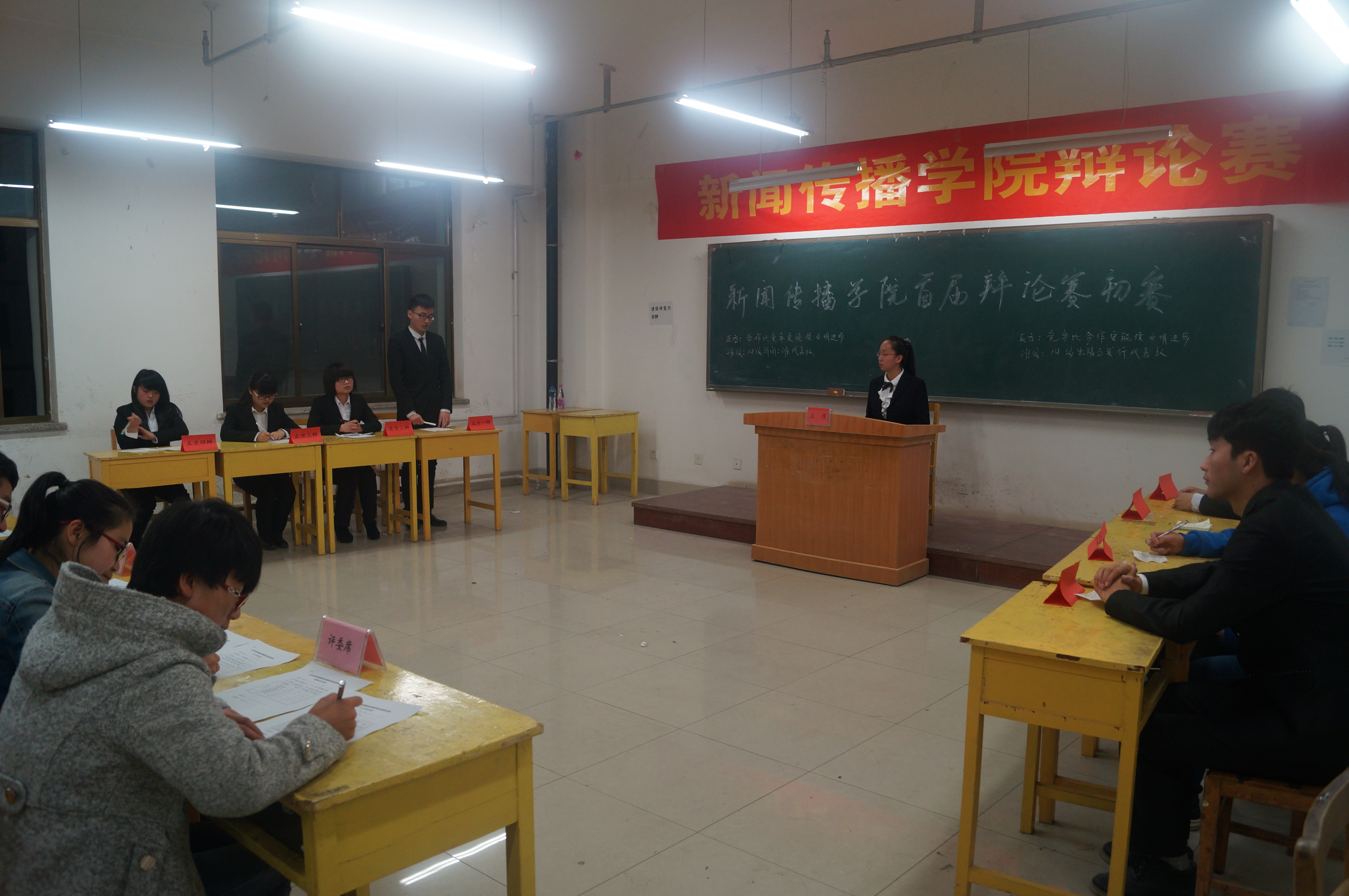 本次比赛分为立论、攻辩、小结、自由辩论、总结陈词、观众自由提问及评委点评7个环节,新闻学二班与出版与发行班,影视编导班与新闻学一班,分别以“合作与竞争谁更能促进文明”和“老员工创业利弊问题”为辩题展开,要求辩手们在特定时间内完成答辩。辩手们清晰的思路和巧妙的陈词赢得现场同学们的热烈掌声。赛末,金城大专辩论赛优秀辩手陶权有、任磊分别代表评委们做了精彩点评,指出了辩手们的优点与不足,并鼓励他们再接再厉。