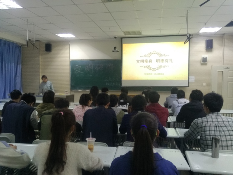 4月12日晚,新闻传播学院15新闻一班全体同学在1-608教室举办了关于“青年文明修身”主题班会。