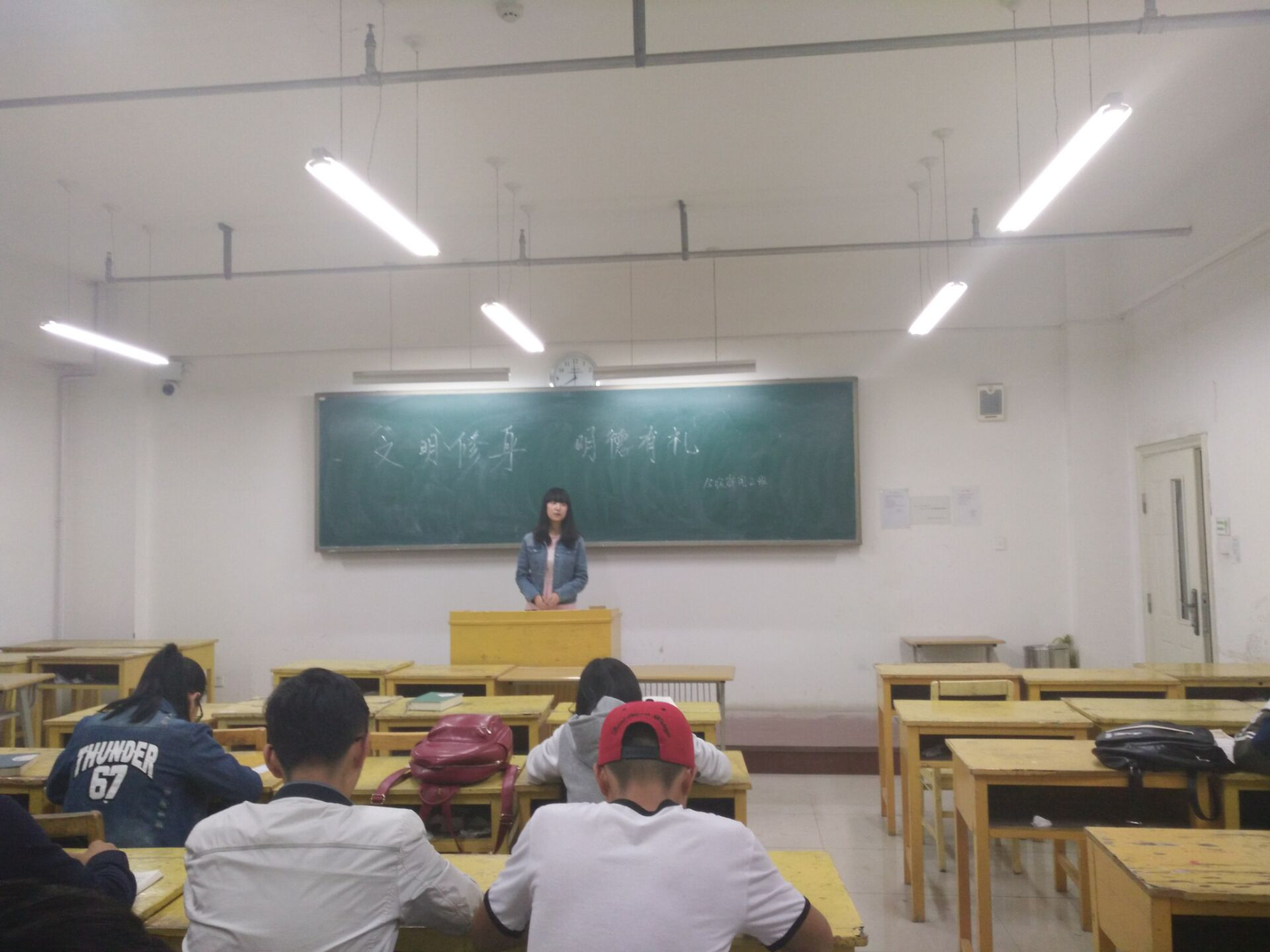 2016年4月14日晚8点,15级新闻二班全体同学在自习室开展了以“文明修身 明德有礼”为主题的主题班会,班主任王颖哲出席。