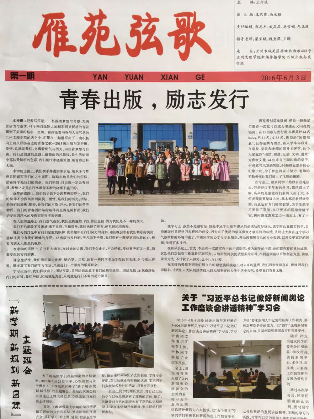 为了更好的传播班级新闻信息,引导校园舆论导向,丰富班级的团学建设活动,365英国上市公司15级出版与发行班的班报《雁苑弦歌》第一期于2016年6月3日正式出刊。该刊是在梁宝毓教授,魏秀萍教授以及班主任王晔老师的指导下,班长王珂琰的积极组织下完成的。