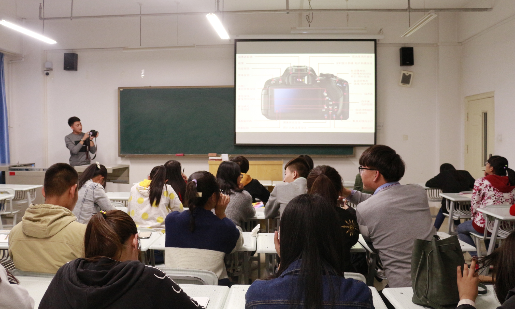 培训伊始,尹俊达站长为为现场同学作了单反相机的结构及一些基本使用方法的普及,并且通过一段视频为同学们展示了构图的基本方法及技巧。他深入浅出地向同学们介绍了光圈、快门速度、感光度等专业词汇的意义,并且通过实例为同学们分析了新闻摄影常见的活动如何拍摄,同时结合了当前所在教室的环境,指出活动照片拍摄的要点。现场同学认真听讲并做笔记,他们纷纷表示学有所获,并对尹站长精彩的讲解报以热烈的掌声。
