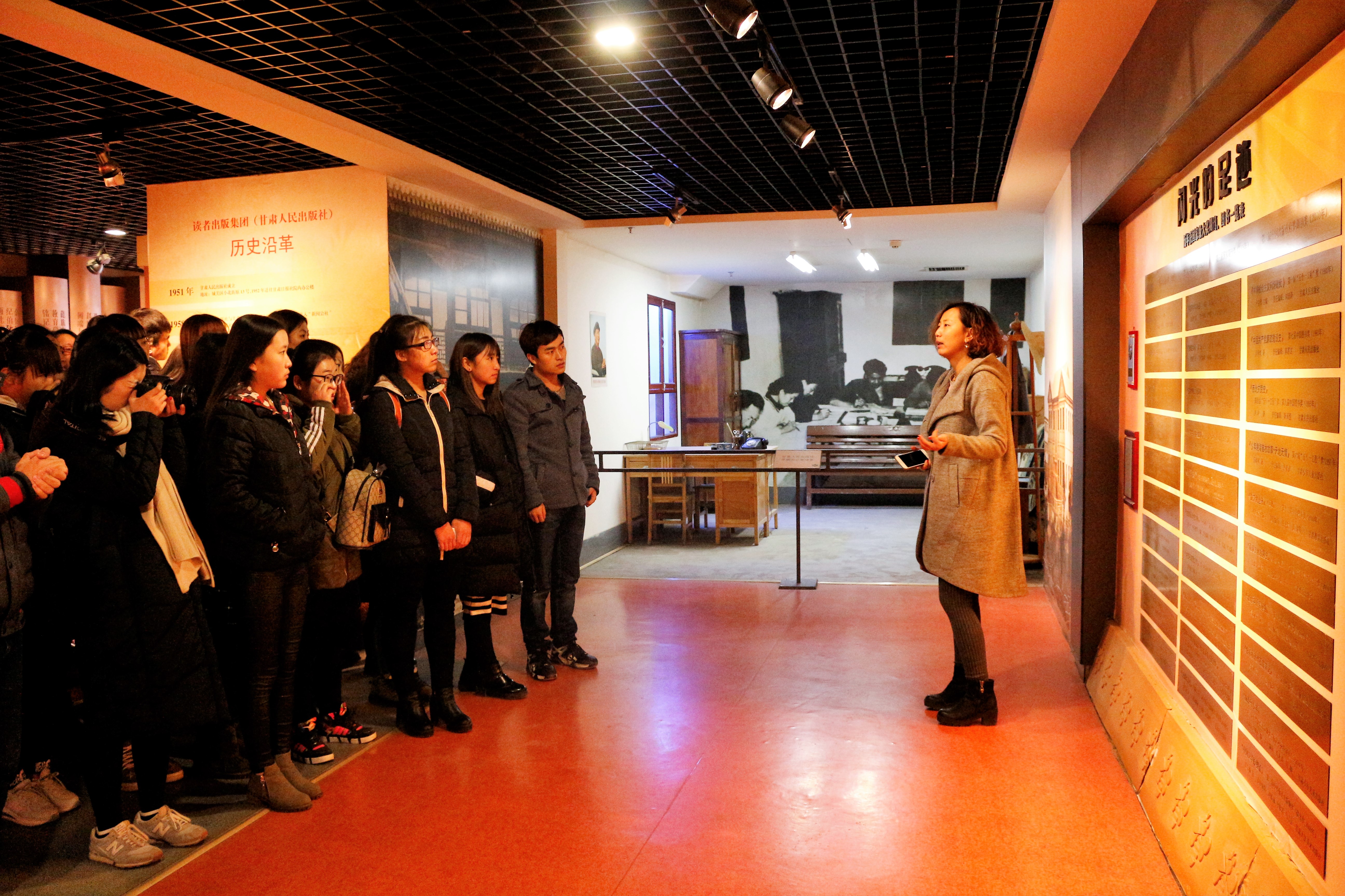 读者出版集团出版业务部的孙晓梅老师首先带领着同学们参观了《读者》历史展馆,并对《读者》杂志的发展历程以及读者出版集团曾经发行过的书籍进行了介绍。