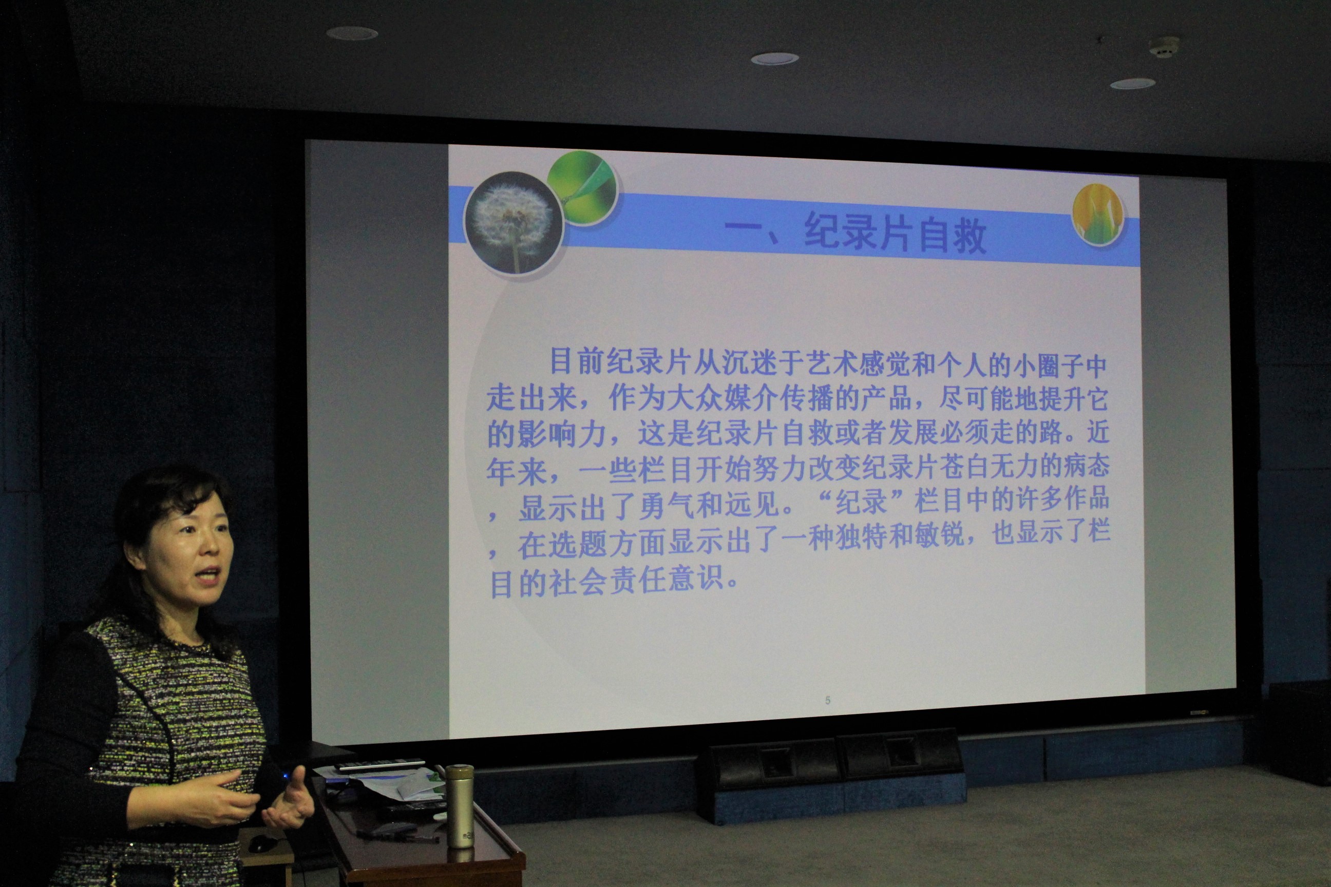 本次讲座以纪录片的发展趋势为讲授重点,围绕纪录片的发展历程展开,内容充实。首先,刘洪艳教授通过播放纪录片《舌尖上的中国》,阐释了当前中国纪录片市场的现状及发展趋势、介绍了中国纪录片的发展历程,以及拍摄时需要注意的各个方面,其中特别强调了纪录片不同于专题片可以加入个人感情,纪录片是纪实性性艺术,要客观、中立。