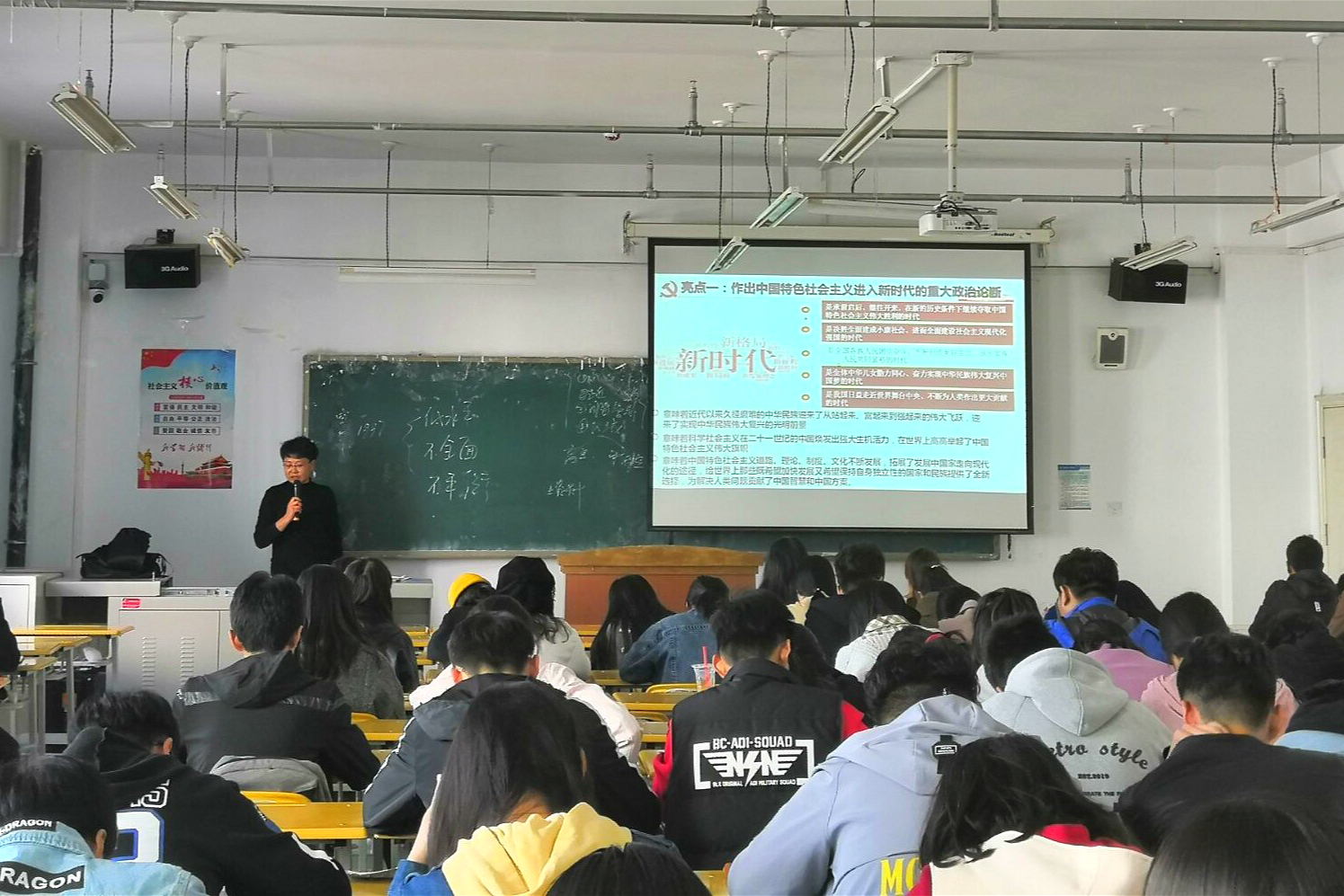 党的十九大,是在全面建成小康社会决胜阶段、中国特色社会主义发展关键时期召开的一次十分重要的大会。首先,费教授结合生活实际向同学们分享了她对中国小康社会的理解,并表示邓小平“虽不富裕,但日子好过”是对小康社会这个概念最生动形象的解释,使入党积极分子对小康社会有了全新的理解。接着,费教授从十九大报告主要精神、亮点和党章修改的主要内容三个方面阐述了十九大会议的内容。