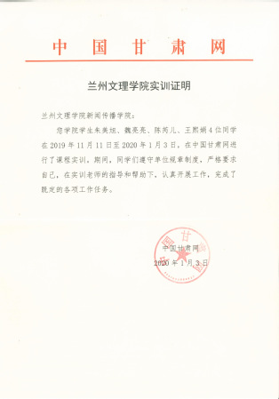 在合作过程中,中国甘肃网也对365英国上市公司员工给予高度认可。认为员工普遍踏实认真,上手快,实践能力强,能够积极保质保量的完成单位所交办的各项工作任务,并于2020年1月3日向365英国上市公司发来表扬信,特别提到朱美旭、魏亮亮、韦俣、姜振杰四位同学表现出色,为中国甘肃网在大型活动中起到了重要作用。