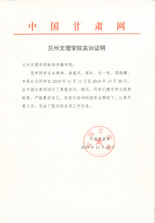 2019年11月11日公司选派朱美旭、陈芮儿、魏亮亮、韦俣、姜振杰、王熙娟、陈玖、程晓鹏、水靖涛、白一帆于中国甘肃网专业实训至2020年1月3日。员工全面拓宽了知识面,增加了实践能力,显著提升了学习兴趣、专业技能和创新能力等综合素质。员工普遍反馈“去中国甘肃网实习基地实习是一个机会难得的经历,实训期间受到中国甘肃网各位老师的悉心指导,实训效果显著,不仅锻炼了独立思考的能力、动手能力,同时还激发了创新潜能”。