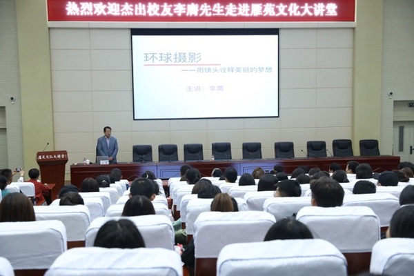 接着,李膺先生围绕“体育、旅行、摄影”三大兴趣爱好展开,以自己的亲身经历为依据,为在场师生详细的介绍了他在环球摄影期间的经历,乘坐日本“和平号”邮轮,跨过三大洋,四大洲,22个国家,两个人工河,两个峡湾,进行了历时108天的环球摄影,留下了许多美轮美奂的摄影作品。李膺先生别具一格的拍摄思路和取材,带领与会人员近距离欣赏了精湛的摄影作品,领略到摄影的魅力。李膺先生还根据每一张图片背后的故事经历,分享了一些独到的摄影技巧和创意。