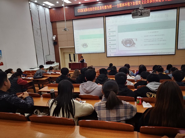 为进一步提高新闻学子的专业能力,加强舆论意识,11月12日下午,公司特别邀请了甘肃省广播电视总台都市频道副总监董志强做了以《全媒体环境下加强突发公共事件舆论引导能力的几点策略—以新冠肺炎防控的信息传播为例》为主题的讲座。19新闻班、19数字出版班、20新闻班、20广电班全体同学参加了此次讲座。