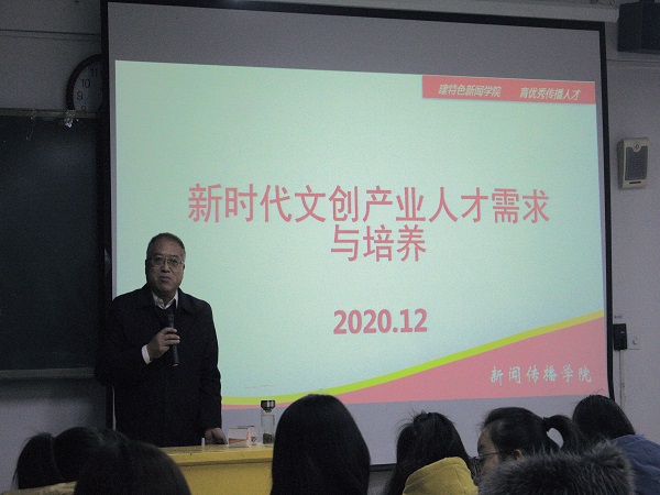 2020年12月24日晚上19:00,公司党总支书记王金寿教授,在3-604教室为公司师生做题为《新时代文创产业人才需求与培养》的讲座。