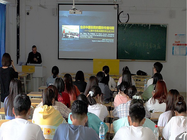 讲座上,余克光从国际视角浅谈高速信息化的环境下信息传播的利弊,并以当下中美关系为例,讲述发达国家和发展中国家之间的相关舆论战役转播,他从四个方面进行了不同角度的深入讲解以便于同学们理解。