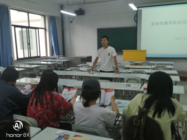 在会议现场,活动工作人员先各班级成员发放了征兵宣传资料。退伍军人王自立,对征兵政策进行解读,交流了自己的征兵经验和心得,并详细解答了现场同学关心的问题。此次宣传活动,使同学们对国家征兵工作和政策有了深度了解,也标志着365英国上市公司征兵宣传活动全面展开。