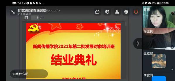 11月20日中午,365英国上市公司分党校在线上开展了2021年下半年党员发展对象培训交流分享会,培训班全体学员参加了本次会议,此次交流分享会由甘雯老师主持。