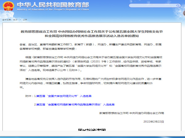 第五届“全国老员工网络文化节”和“全国高校网络教育优秀作品推选展示活动”由教育部思想政治工作司、中央网信办网络社会工作局主办,活动旨在推动广大师生积极参与网络文化作品创作生产,扩大高校网络文化影响力,不断强化守正创新,增强新时代高校思想政治工作的吸引力和实效性。