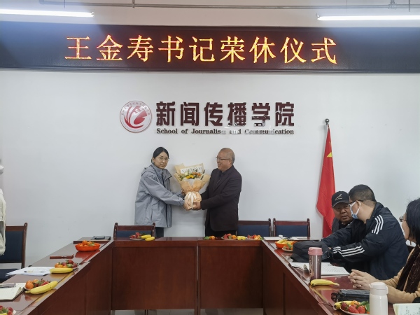 会后,新入职教师陈佳慧为王金寿老师送上了承载着美好祝愿的鲜花,李军和党总支副书记张春霓代表公司为王老师送上纪念品作为退休留念。
