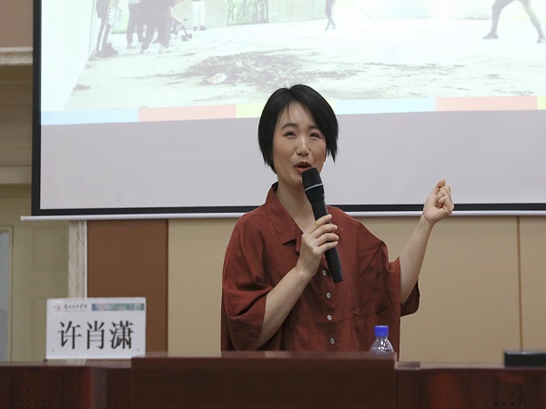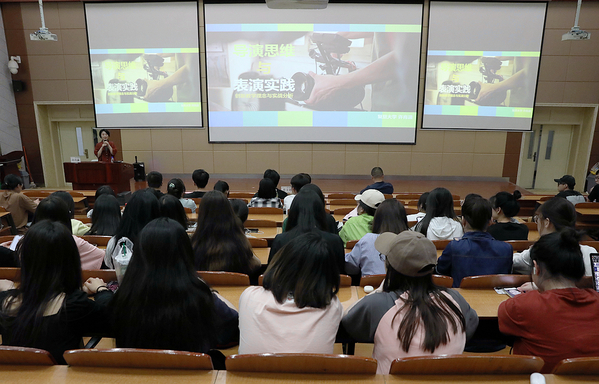 许肖潇老师从电影审美立电影观念、片场体验习电影创作和电影分解修电影思维三个方面入手,强调需要通过大量观影积累,学习大师作品、团队协作翻拍经典电影,自主进行电影主题探索,就能切身体验并感知视听语言的妙用、学习每个职能部门的运作机制以及电影创作的技能,并久久为功、毫不松懈地培养自己的导演思维。她还以自己的一些实践作品为案例,讲述了如何将演员表演有效地“导”出来的许多实战经验。她还结合当下短视频制作,讲授了导演如何通过自身学习建立的完整电影思维来引导不同职能部门人员进行协同工作的使用技巧。