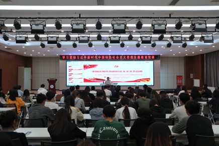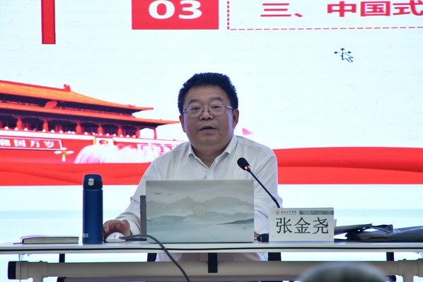 张金尧围绕两个纲领性文件、重大意义和目标要求、中国式现代化社会主义文艺的理论品格三个内容开展讲授。首先他提到两个纲领性文件:《中共中央关于党的百年奋斗重大成就和历史经验的决议》、《高举中国特色社会主义伟大旗帜为全面建设社会主义现代化国家而团结奋斗》,并指出党要牢牢掌握对意识形态工作领导权,高度重视传播手段建设和创新,加快国际传播能力建设,增强中华文明传播力影响力。