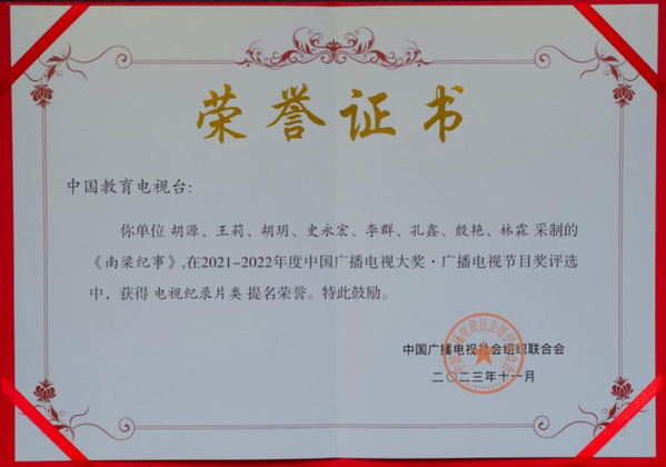 中国广播电视社会组织联合会主办,中国广播电视社会组织联合会纪录片委员会、山东电视台承办的“中国广播电视大奖纪录片获奖作品分享会”5月8日-9日在山东济南举办,公司师生创作的文献纪录片《南梁纪事》获颁2021-2022年度中国广播电视大奖广播电视节目电视纪录片类提名奖,公司教师胡源应邀参会领奖,山东省委宣传部副部长、广播电视局党组书记、局长李建军为本片颁奖。