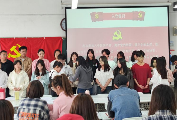 最后,由支部书记为新入党的预备党员佩戴党徽,并带领预备党员在党旗前郑重宣誓。